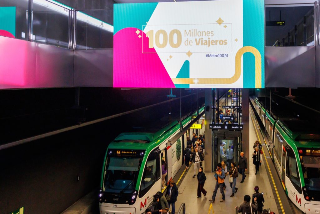 Pantallas de gran formato de la Estación Recogidas emitiendo el spot de la campaña de agradecimiento a los 100 millones de viajeros