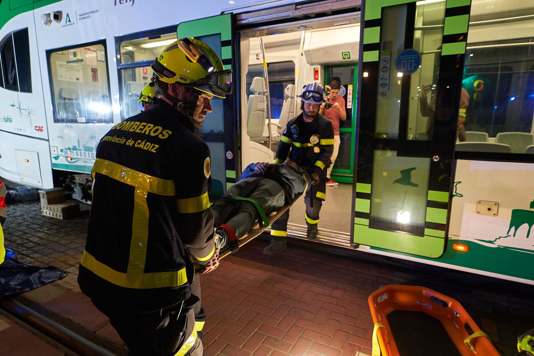 De esta forma, el Trambahía simuló una colisión con un vehículo que cargaba un líquido inflamable, en la avenida del Mueble, justo la entrada desde el tramo interurbano a Chiclana de la Frontera en dirección Pelagatos. Como resultado de la colisión, varios heridos de distinta gravedad en el interior del tren, y una persona atrapada bajo el tranvía.